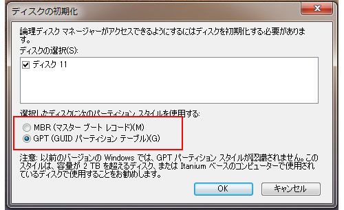 3TBのHDDをPCに接続し、初めてフォーマットする際に、パーティション管理システムを選択するメニューが表示される。このメニューでは、MBRかGPTのどちらを利用するか選択できる。3TBめいっぱいに利用したい場合は、GPTを迷わず選択しよう。これで、3TBのHDDとして利用できるようになる。