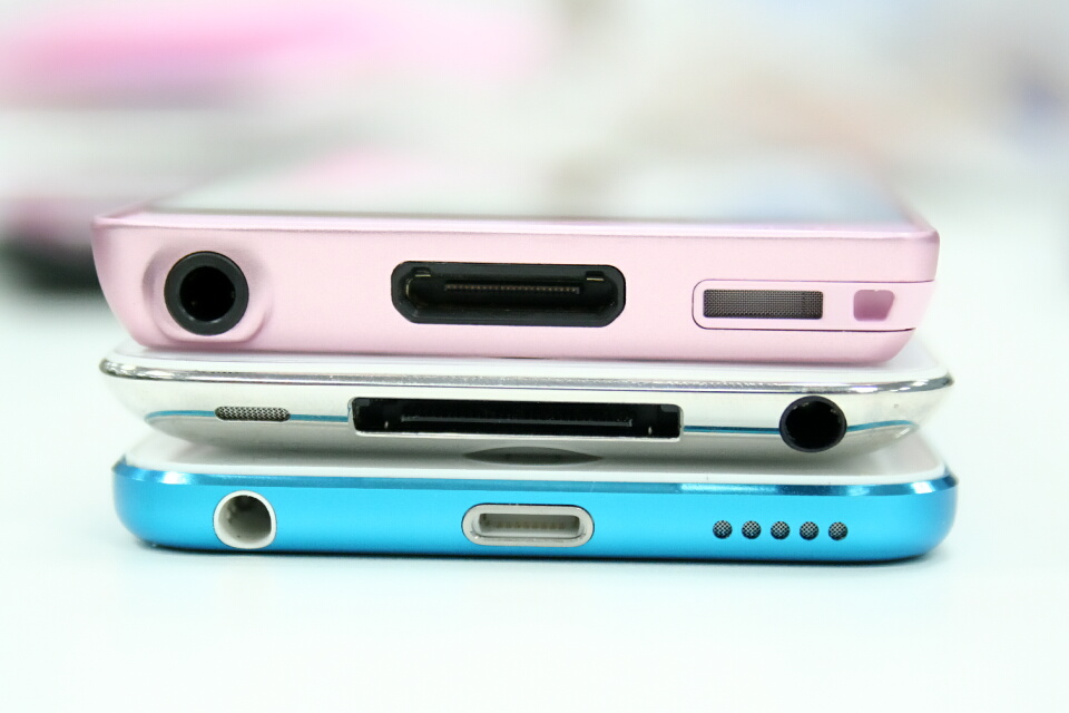 一方で、iPhone 5と同様に、今回から極小サイズのコネクタ「Lightningコネクタ」を採用した第5世代iPod touchと、第7世代のiPod nanoと、Dockコネクタを搭載した第4世代iPod touchではそのコネクタのサイズが大きく異なるのが分かります。