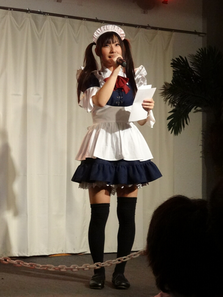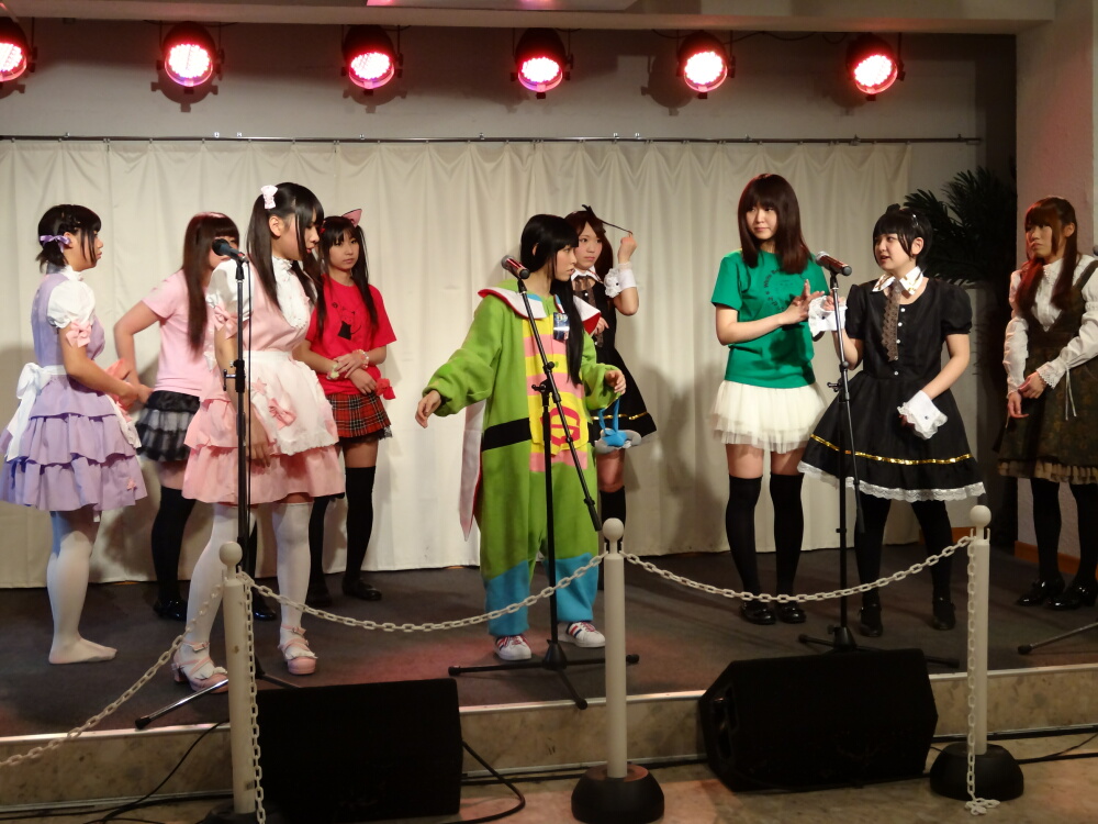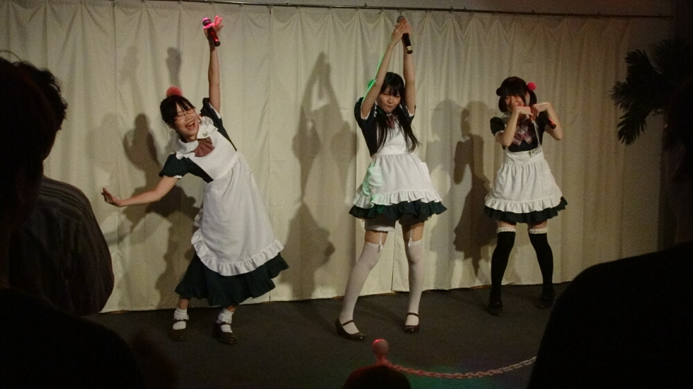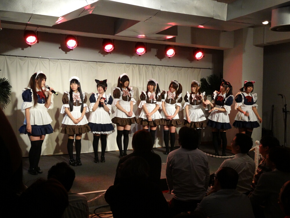 ホワイトブリムのメンバーが、ソロやユニットで色々な曲を熱唱&ダンスを披露。お客さんも普段お店で“ご奉仕”されている“ご主人様”が中心なので、親近感があり盛り上がりも相当のもの。普段お店では見れないメイドさんの姿や、このイベントだけの暴露話コーナーなどもあってトークの場面もかなり盛り上がっていました。
