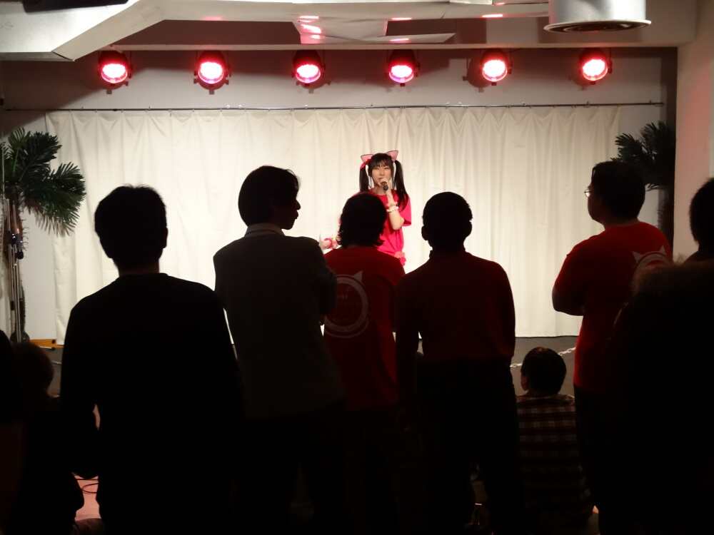 開場直前まで熱心にリハーサルを行っていました。今回のイベントは秋葉原のメイドカフェ「JAM Akihabara」のメイドさん3人も参加するコラボイベントです。開場前には円陣を組んで気合いを入れます。