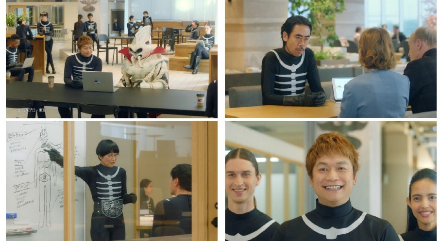 CMは埼玉県内某所に実在する「最先端のオフィス」で撮影されました。その広さ、最新の設備にショッカーの戦闘員多数の壮大なシチュエーションに香取さんも驚いたということです。香取さん自身もおなじみの戦闘服に身を包み、早速「イカデビル」との2ショット撮影から開始。顔を超接近させた芝居に、現場も笑いに包まれました。