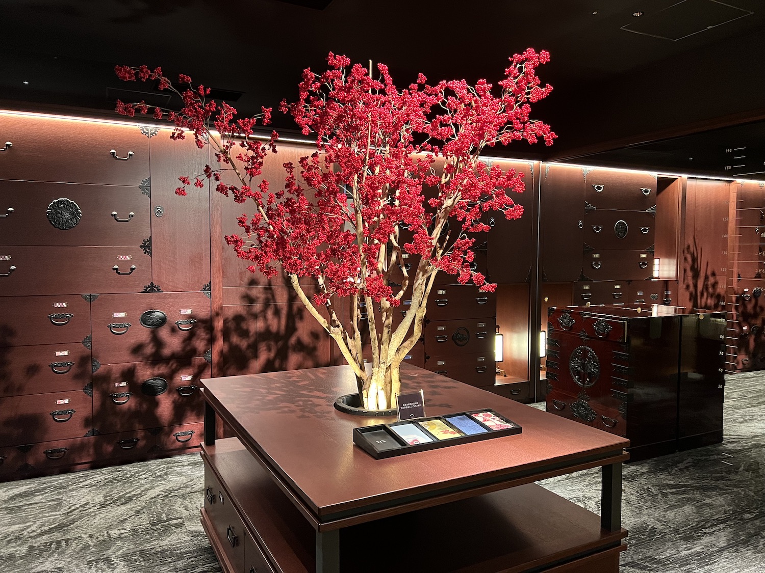 フォトスポットでもあるのが仙台箪笥にインスピレーションを受け、選べる浴衣を収納する棚。