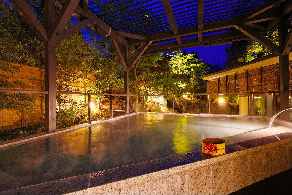 「滝ノ音(タキノト)」と名付けられた露天風呂。庭に設置された滝や水音を楽しみながら入浴できます。旅の疲れを癒やすのはもちろん、ライトアップされた滝を眺められる夜や気持ちの良い朝に利用するのもオススメ。私もしっかり3度入浴しました。