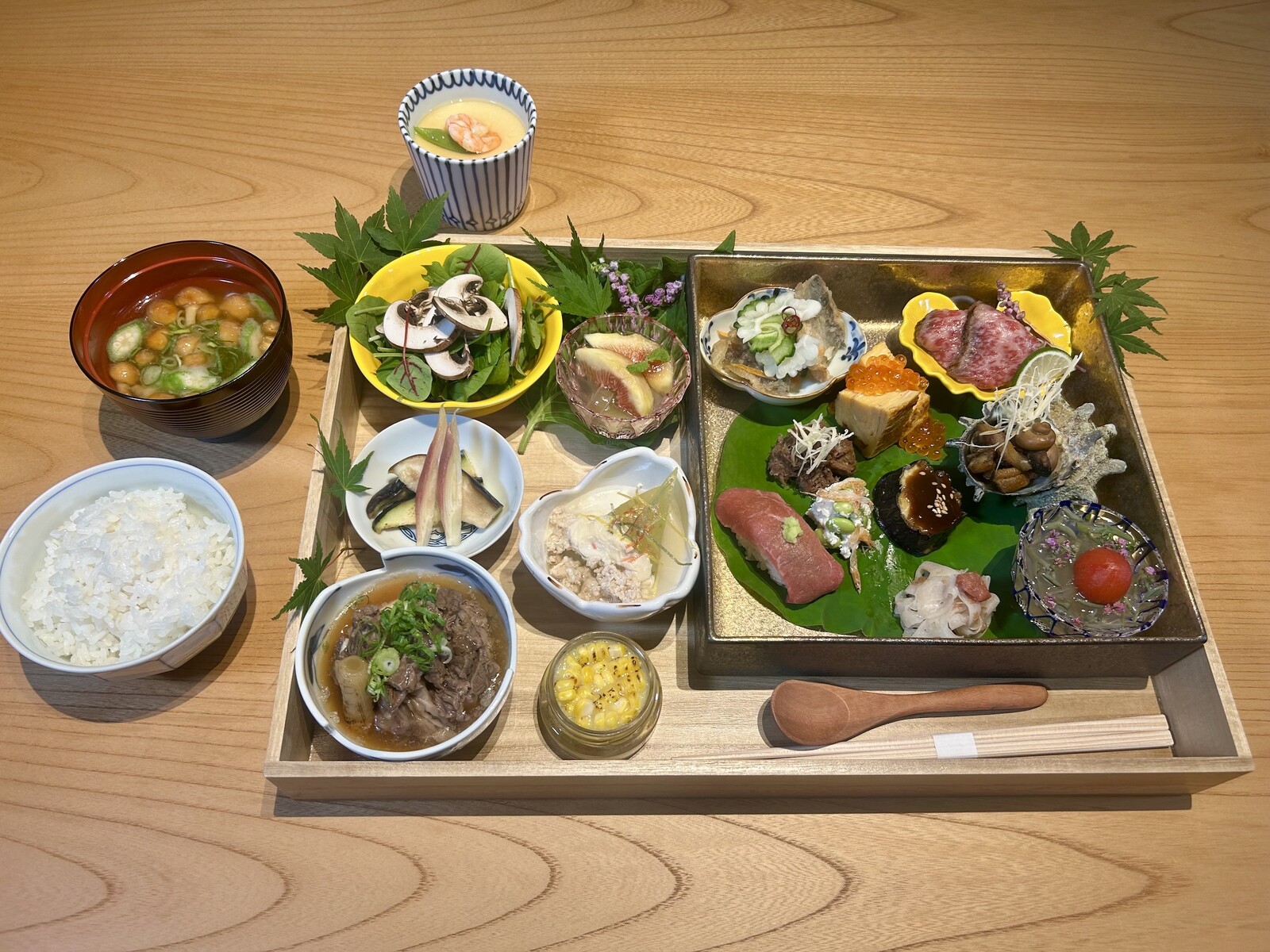 そこで提供されているのが高級和牛を使用した「肉屋の朝食御膳」です。御膳は「2,800円」、「3,500円」、「4,500円」(すべて税込)と3種類ありますが、特に注目したいのが限定20食の2,800円のもの。肉寿司、ユッケ、串焼き、卵焼き、天ぷら、デザートなど計18品以上が御膳に盛り合わせられ、朝のひとときを贅沢に演出してくれます。