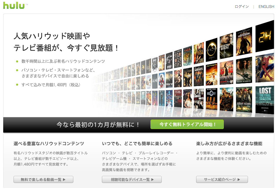 アメリカのテレビドラマやハリウッド映画を中心に、オンラインで視聴できるサービスHuluの日本版が2011年9月1日に始まった。